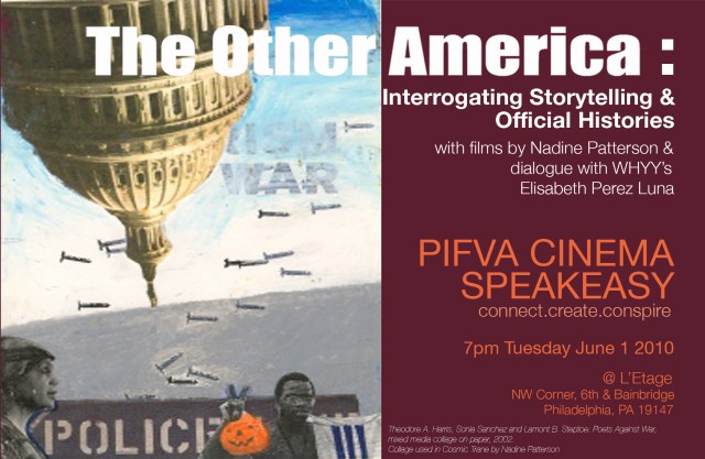 On Tuesday June 1, 2010 The Philadelphia Independent Film & Video Association (PIFVA) presents a Cinema Speakeasy event at L’Etage (6th and Bainbridge in south Philadelphia) featuring three documentaries by Nadine Patterson. In between films, WHYY’s/NPR’s Elisabeth Perez Luna will lead a discussion about Ms. Patterson’s documentary work and engage Ms. Patterson and the audience in a provocative analysis of current media practices. How are stories selected? Who has the right to tell them? What is mainstream media missing when it comes to depicting the Black community? How does the official story effect how we view each other?